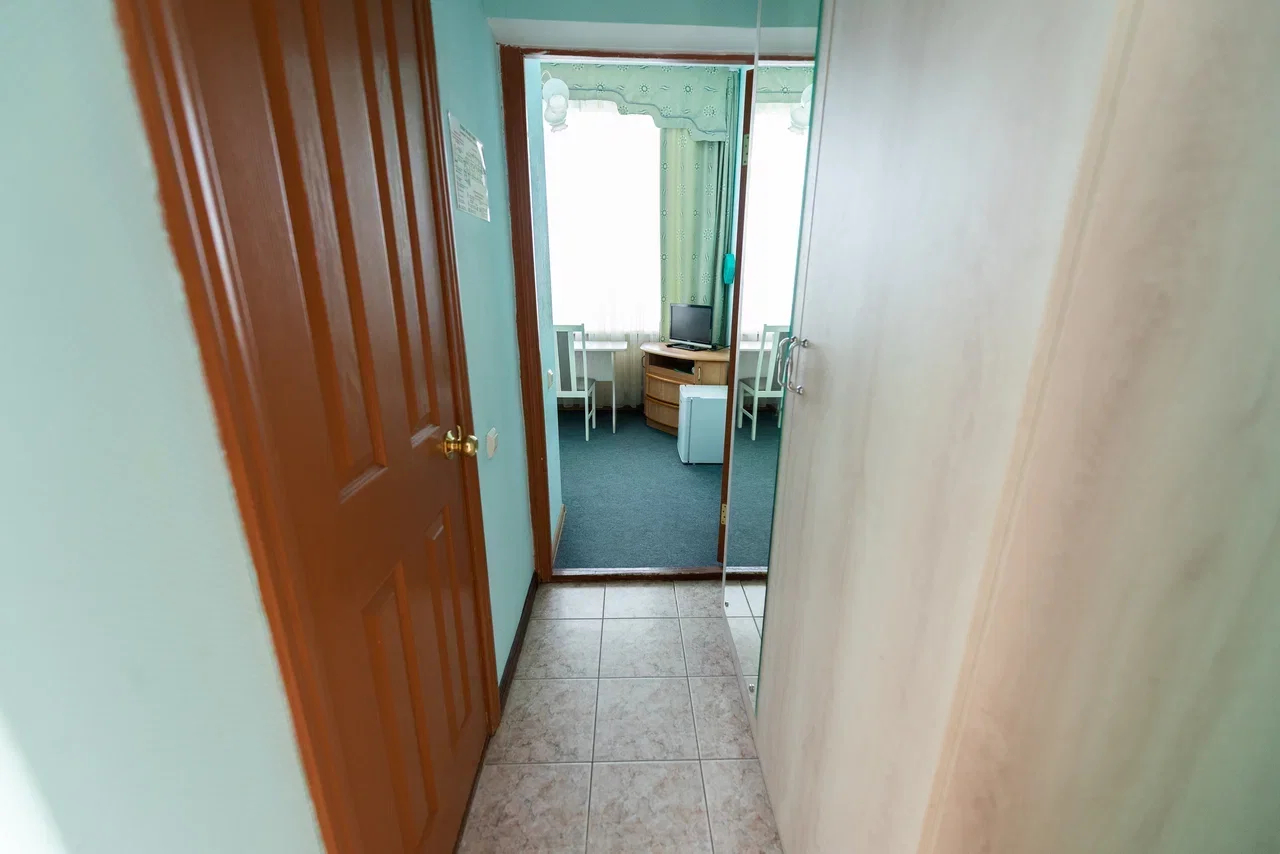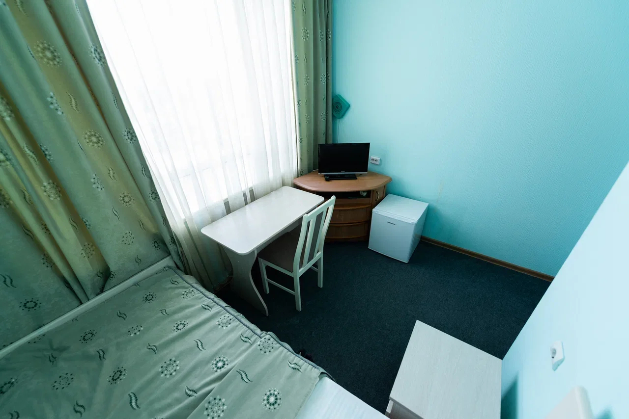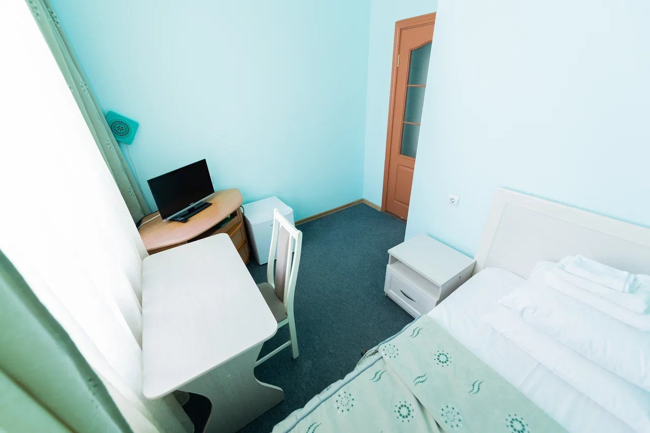 1 осн. место. Мебель: кровать односпальная, прикроватная тумбочка, стол, стул, тумба, шкаф. Оборудование: сушилка для белья, телевизор, холодильник, чайный набор посуды, электрочайник. Санузел: с душевой кабиной, туалетные принадлежности. Сервис: смена полотенец, смена постельного белья, уборка номера.