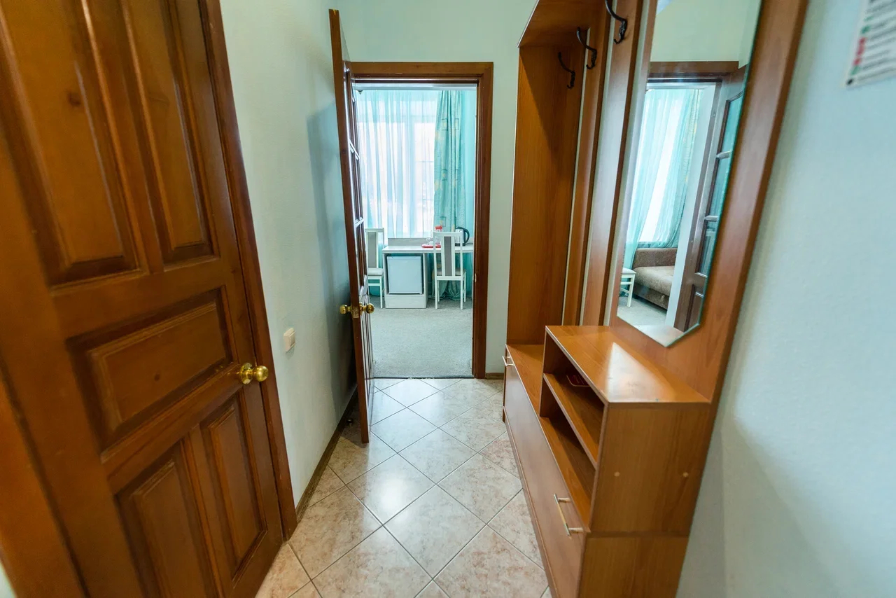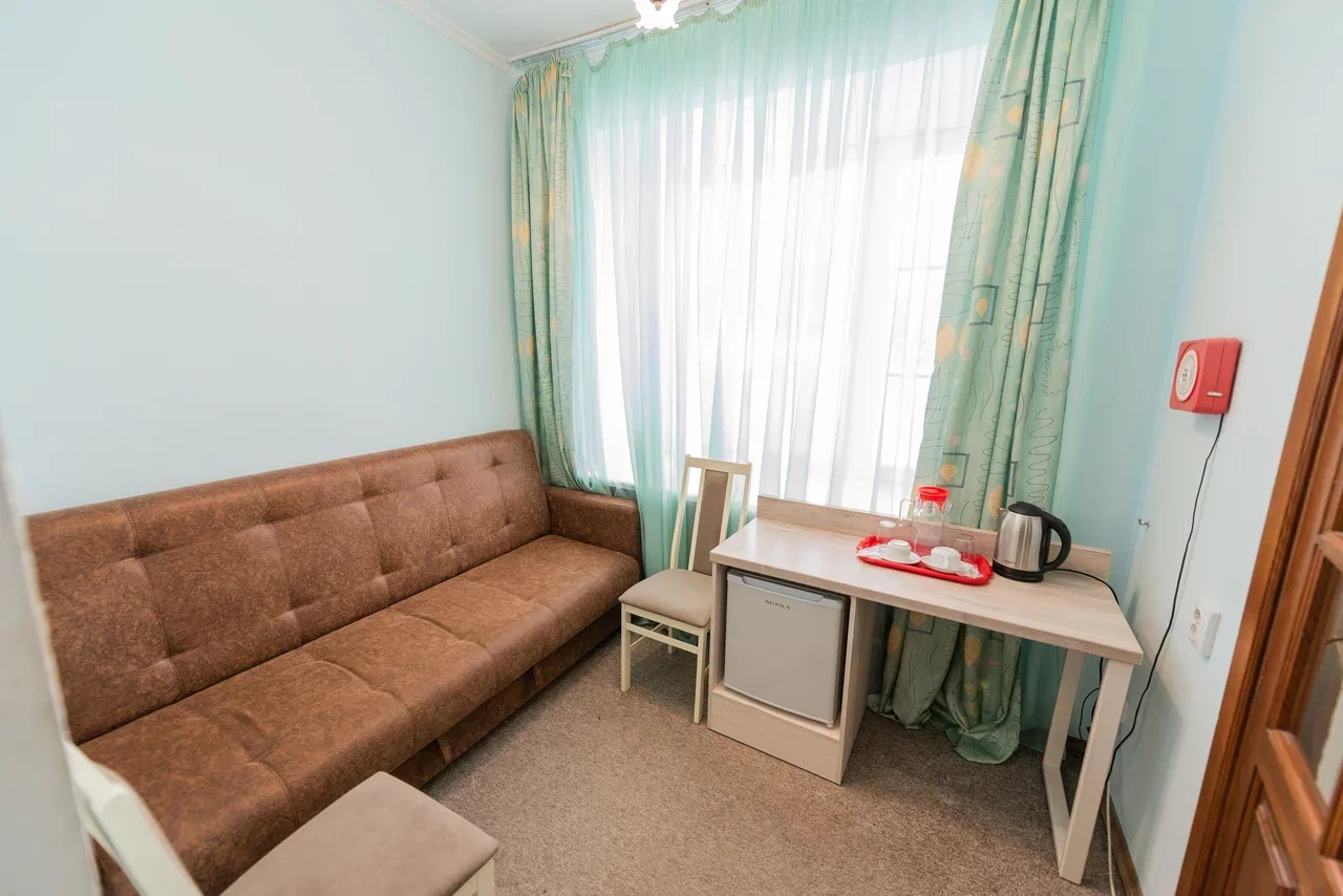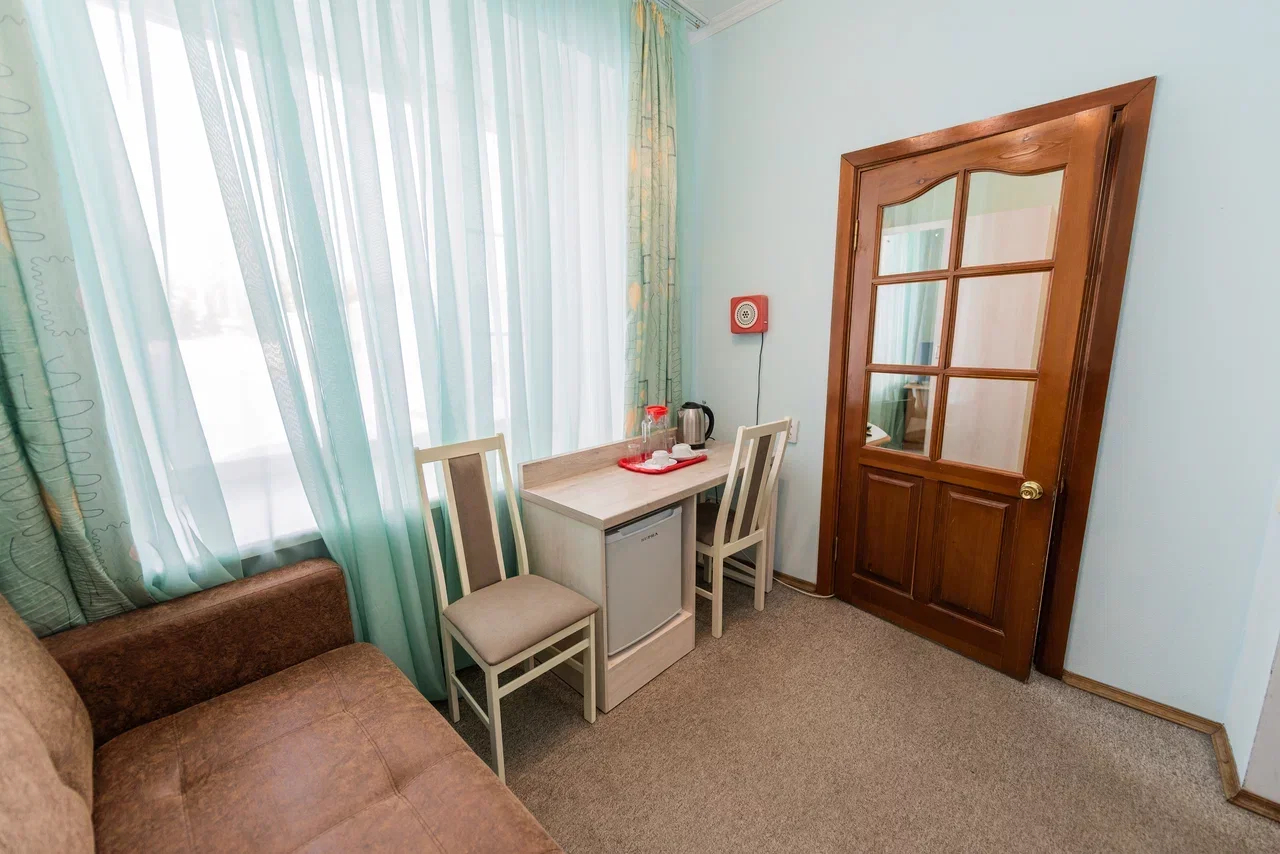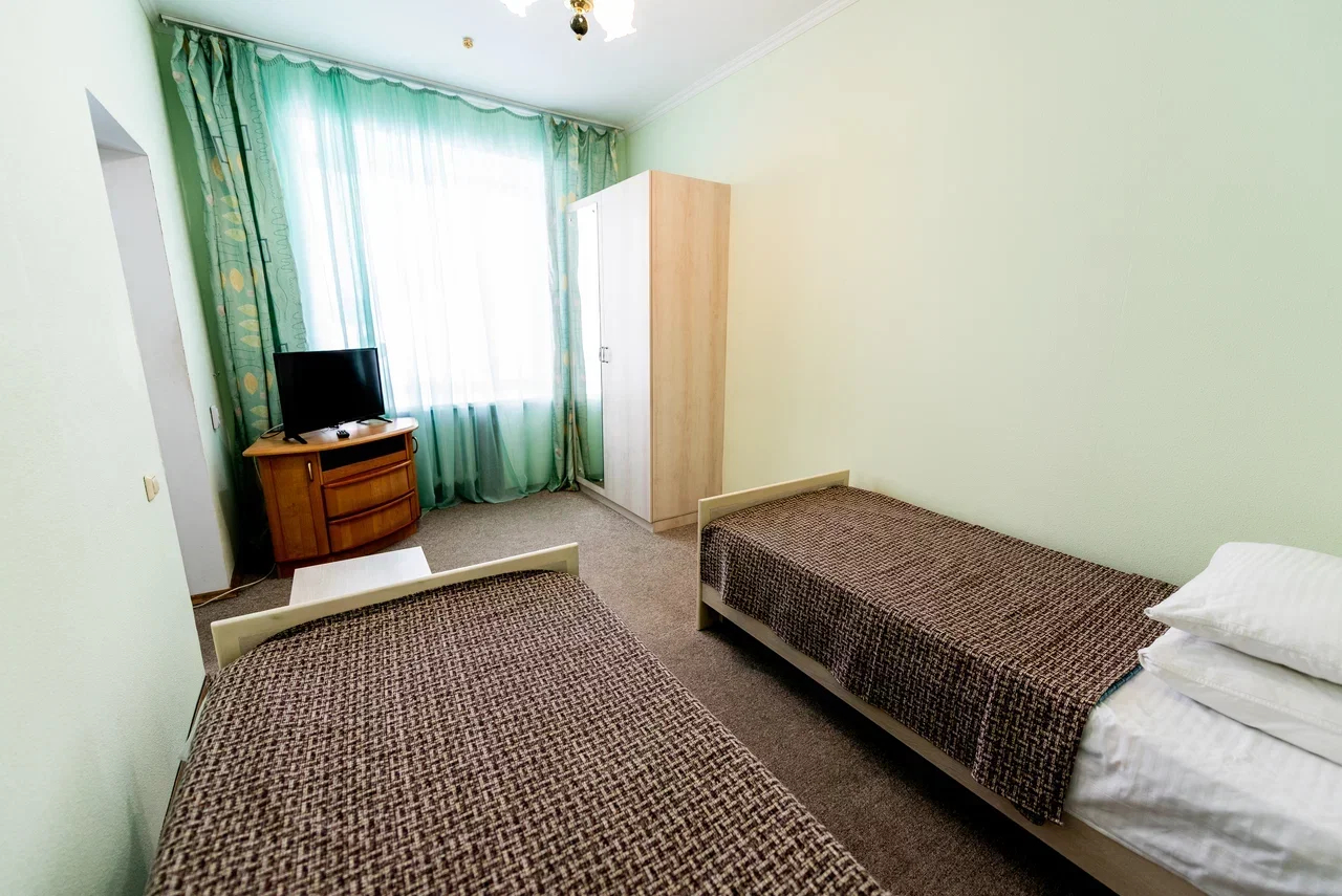 Площадь номера - 25 кв.м. 2 осн. места. 1 доп. место. Мебель: диван раскладной, кровати односпальные, прикроватные тумбочки, стол, стулья, шкаф. Оборудование: сушилка для белья, телевизор, холодильник, чайный набор посуды, электрочайник. Санузел: с душевой кабиной, туалетные принадлежности. Сервис: смена полотенец, смена постельного белья, уборка номера.